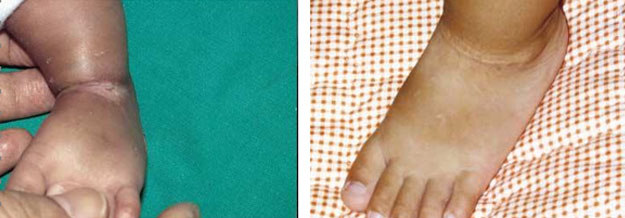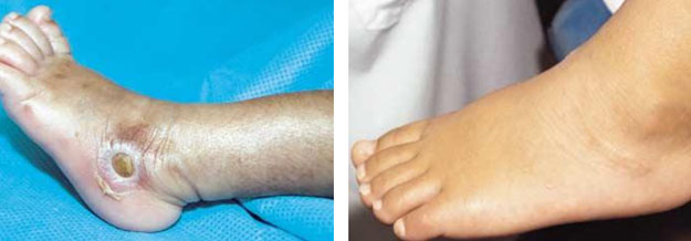 图5.A左足输注营养液液渗漏性损伤 图5.B应用再生医疗技术治疗2年后