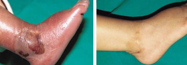 图6.A 左足外侧营养液渗漏性损伤的表现 图6.B 应用再生医疗技术治疗20个月后