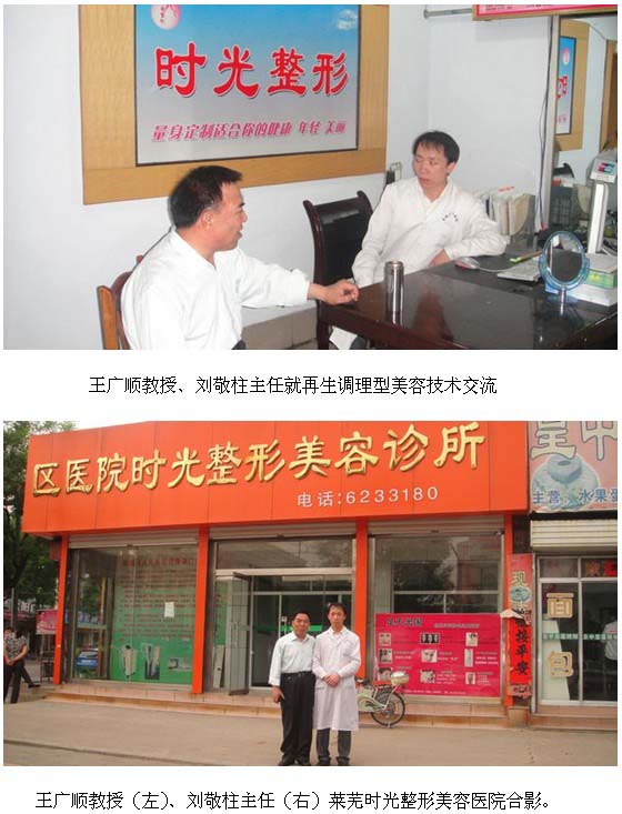 2011年5月17日~18日,应莱芜时光整形美容医院刘敬柱主任的邀请,北京再生医学研究所医疗专家王广顺教授和山东办事处刘治国同志来到该院,就“引进应用再生复原技术”进行了交谈,达成了“再生复原医疗技术”产品售后服务定点协议,并将再生复原技术为特色形成的美容项目界定为“再生调理型美容”项目。