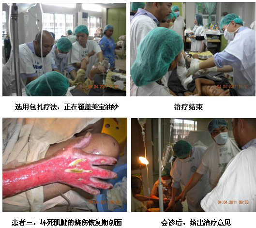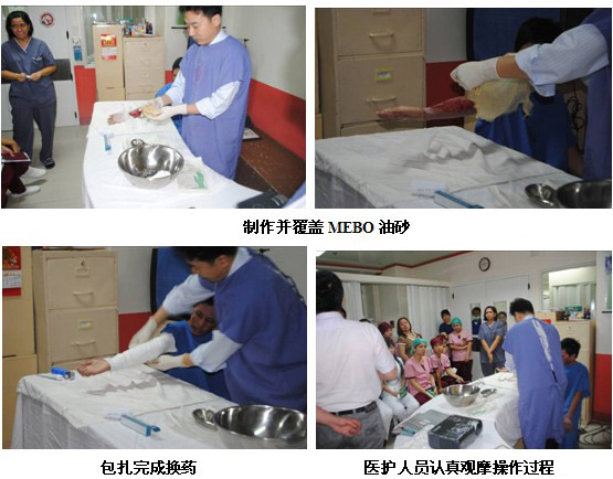 随后王教授来到病房会诊一名褥疮患者,并演示换药程序。该病人的压疮在会诊前有坏死腐皮没有清除。王主任亲自示范如何彻底清创,并展示包扎疗法的操作过程。有一名医生表示,原先他只是涂上烧伤膏,然后包扎,并没有覆盖MEBO油砂,此次培训会后,他知道了并规范了包扎疗法的使用。整个会诊及换药过程持续了35分钟,医生们表示收益匪浅,虽然使用了MEBT/MEBO很多年,但是仍然还有很多需要深入学习并实践的知识。