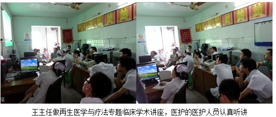 2012年9月5日,应铜梁县人民医院普外科陈明主任的邀请,中国中西医结合学会烧伤专业委员会常委兼秘书、《中国烧伤创疡杂志》副总编辑、北京美宝烧伤创疡研究所副所长、第二临床研究部主任王洪生研究员来到该科室,给全体医生及护理人员20多人进行再生医疗技术讲座并进行学术和技术上的交流和探讨。王主任就“再生复原疗法在深度烧伤及难愈性创面治疗新进展”作专题学术讲座,王主任结合大量真实的临床病例图片和图像,将再生复原疗法在深度烧伤及难愈性创疡创面治疗上的这种新方法对不同深度的烧伤创面及各类难愈创伤、溃疡创面的规范化处理方法与技巧、注意事项等进行了细致地讲解。讲座结束后,在该科室医护人员强烈的学习气氛中,王教授和大家一起讨论了再生医学医疗技术的要点及难点。陈明主任表示,他们应用再生医疗技术是从上个世纪80年代开始,应用效果非常好,但没有想到这已经发展成为一整套的科学体系,应用到各种疮疡创面上效果都如此神奇,我们今后也一定将再生医疗技术在该科室应用得更好,造福一方百姓。