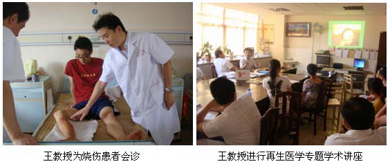 在学术讲座开始前,王教授应邀首先深入该医院外一科(包括:烧伤整形科、神经外科、泌尿外科)病房为一名排气管烧伤患者会诊,指导规范的创面处理方法。随后王教授应邀在外一科医生办公室进行了“再生复原疗法在烧伤及难愈性创面临床规范化处理”的专题学术讲座,该医院主管副院长兼外一科主任黄永东主任医师主持并全程聆听了学术讲座,该医院医务科长也参加了学术讲座。
