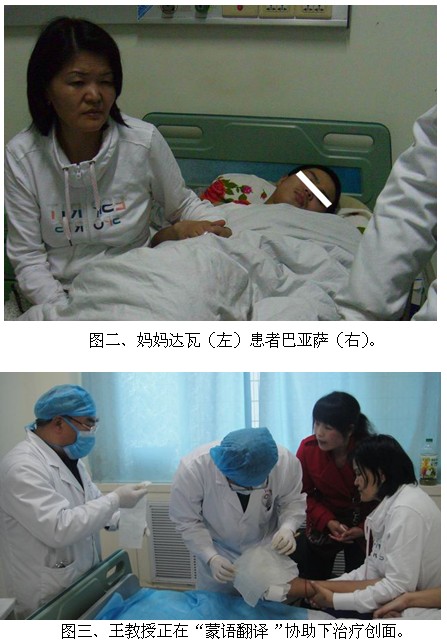 由于亲戚临时有事没来,母子二人为了保住巴亚萨冻伤的脚,从蒙古国不远千里来看病。大家只知道躺在病床上的小伙子名叫巴亚萨,20岁,右脚部被严重冻伤14天,脚趾头变黑。初时只见蒙古国小伙的右脚缠着厚厚的纱布绷带,旁边的纸上写着他的名字(BAYASAA)。当王教授问他问题时,他只能用迷惑和摇头来回答。由于语言不通,巴亚萨喊疼时大家都听不懂。他们出去买点食物都得给亲戚打电话问清楚才能出去买。在“诊疗计划”也无法告知患者的难题下,王教授和医生求助了电视台、报纸等媒体向社会征集蒙古语翻译的志愿者,好解决和患者的交流问题。