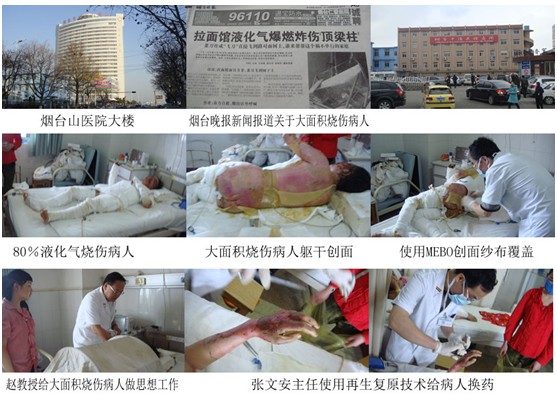 烟台山医院烧伤整形科曾在2011年10月份在张文安主任的带领下使用再生复原技术治疗一例85%大面积烧伤病人获得成功。此例80%液化气烧伤病人刚送到医院,血压下降,张文安主任沉着应战双通道液体输入抗休克抢救,并早期进行简易清创后创面用MEBO覆盖(因病人信仰伊斯兰教)。在第一时间北京烧伤创疡研究所赵瑞庆教授也赶到抢救现场指导进一步治疗。