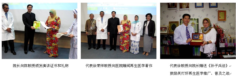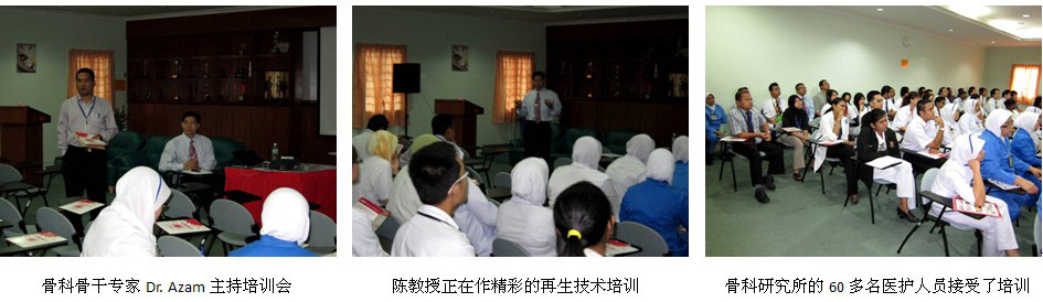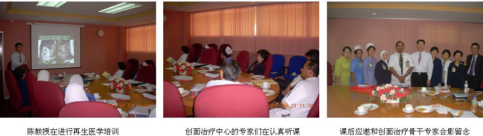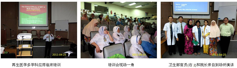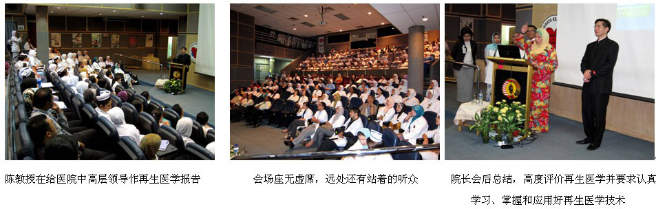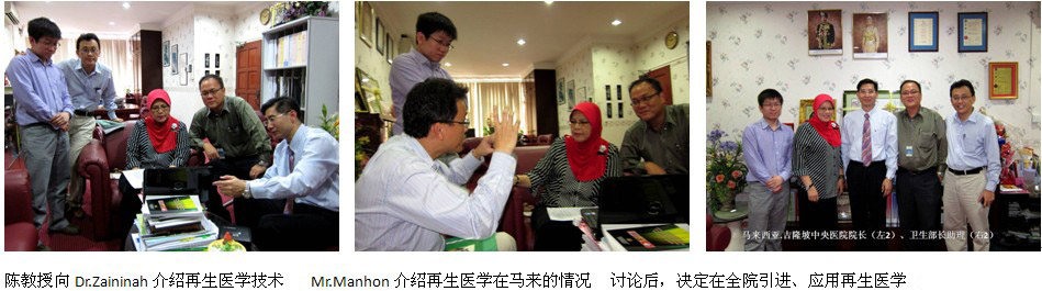 一年后(2011年4月),当医院院长Dato & Dr. Zaininah获知陈教授再次来到吉隆坡时,马上约陈教授到办公室做客。听完陈教授对再生医学的介绍后,院长非常激动,坚定马上组织起全院的各科主任和护士长,请陈教授进行再生医学报告和进行培训,同时还组织召开了专题会议,商讨全面引进再生医学技术和展开临床研究、申请将MEBO尽快进入到国家基本用药范围的计划等。