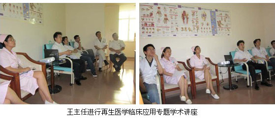 惠阳三和医院从2006年开始在烧伤创疡临床工作中应用烧伤皮肤原位再生复原医疗技术,虽然起步晚,但该医院于2010年3月份引进再生复原疗法治疗创疡新技术,已将再生复原医疗技术全面应用于烧伤、骨科创疡临床工作中,为让该医院骨外科的医护人员更好掌握、应用原位再生复原医疗技术救治大面积深度烧伤,2011年5月20日,中国中西医结合学会烧伤专业委员会常委、中国烧伤创疡杂志社副总编辑、北京烧伤创疡研究所副所长、临床部主任王洪生研究员应邀到该医院做再生复原疗法疗法临床应用学术讲座,在该医院骨科办公室以“再生复原疗法技术在大面积深度烧伤及难愈性创疡创面临床规范化处理”为题为该科室的医护人员进行了专题讲座。该院手外、骨科,以及普外科等医护人员参加了讲座,在学术讲座中,王主任对烧伤的深度划分结合临床图片做了生动的讲解,对烧伤创面前期和后期的处理方法、抗感染、营养支持疗法、脏器功能保护、并发症防治,并结合大量的临床图片对各种难愈性创伤,溃疡创面的规范处理方法与技巧做了详细地讲解。