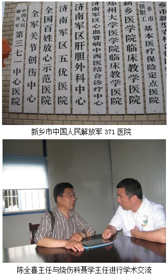 2012年5月10日晚,河南新乡市中国人民解放军371医院烧伤科主任聂学邀请北京美宝烧伤创疡研究所临床部专家陈全喜主任进行学术交流,业务员杨志强随行。