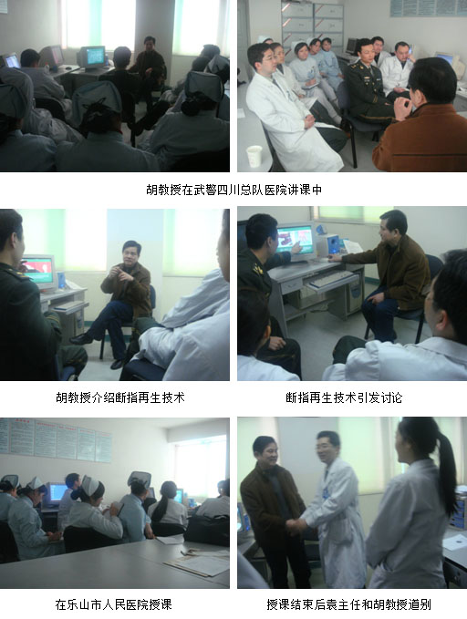 胡教授首先应武警四川总队医院烧伤整形科袁文周主任的邀请,来到烧伤整形科对该科室人员进行再生医疗技术讲座,科室全体人员共计12人参加。胡教授和袁文周主任做了近40分钟的交流,随后开始两个多小时的再生医疗技术的专题讲座。讲座中胡教授从基础的再生医学理论讲到再生医疗技术临床应用,用大量的、翔实的临床病例介绍了不同病种临床规范治疗方法和最新的再生医疗技术临床应用进展。其中微粒皮的种植方法和断指再生的病例介绍引起了大家强烈的关注和热烈的讨论。