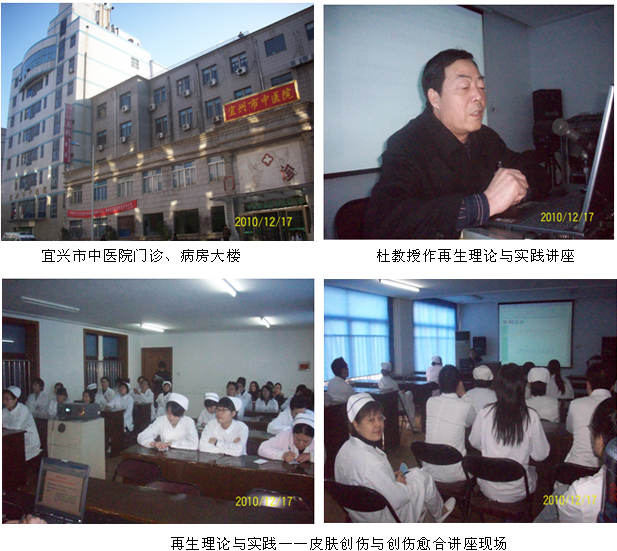 值2010年末岁首之际,中国中西医结合学会烧伤专业委员会常委、北京美宝烧伤创疡研究所临床部杜福勤教授应宜兴市中医院医务科王科长和吕建明副院长的邀请,于2010年12月17日下午在该院会议室举办再生医学理论与技术实践学术讲座。讲座由该院医务科王科长主持,参加讲座的有该院外科、内科、骨科、妇产科、皮肤科、肛肠科、儿科以及有关技术辅助科室120余人,吕建明副院长百忙中抽时间参加了讲座并和杜主任进行了深入交流。