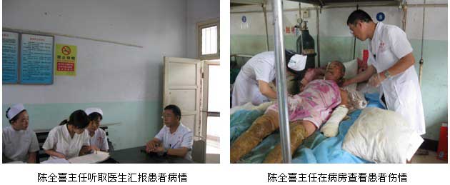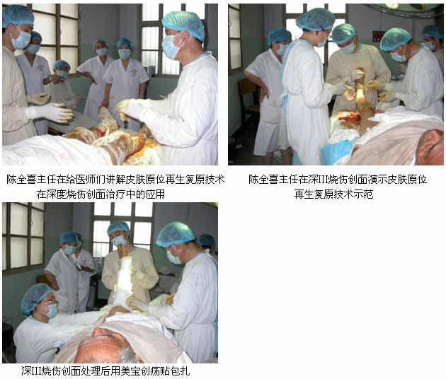 2011年7月2日,北京美宝烧伤创疡研究所临床部专家陈全喜主任应邀来到河南开封空分集团有限公司医院会诊一位严重烧伤患者。患者:张某某,男,64岁。入院诊断:双上肢、双下肢深Ⅲ度烧伤,烧伤面积44%TBSA。患者入院时基本情况:面色苍白,四肢冷,皮肤干燥,脉搏100次/分,呼吸29次/分,血压80/60mmHg,烦躁。经会诊后陈主任指导院方制定了抢救方案。入院立即应用皮肤原位再生复原技术治疗,包括抗休克、保护心肾功能等系统治疗;创面减张,湿润烧伤膏油纱条半暴露治疗;保护肢体血液循环,防止创面损伤加深等措施。待病情稳定后于2011年7月4日上午,在王志英副院长、郑玉红主任和陈全喜主任一起为患者进行了减张耕耘术治疗,术后应用再生医用复合敷料-美宝创疡贴对患者的创面进行了包扎,并根据病情及时换药。目前患者病情稳定,正在进一步的治疗中。
