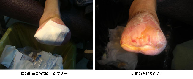 患者徐某,男,59岁,糖尿病20年。因糖尿病足坏疽在某省级医院就诊建议截肢,患者不愿意截肢转院到哈尔滨医科大学第一临床医院就诊。入院诊断:1)Ⅰ型糖尿病;2)右下肢动脉闭塞性右糖尿病足坏疽半年。经使用皮肤再生医疗技术及产品烧伤膏、速愈贴治疗90天,创面基本愈合。