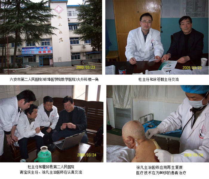 原位再生复原技术2009年在安徽革命老区深入推广,中国中西医结合学会烧伤专业委员会常委、北京烧伤创疡研究所临床部研究员、烧伤创疡专家杜福勤主任应邀走访了安徽省六安市第二人民医院(蚌埠医学院教学医院)外科、霍邱县第二人民医院外科。杜主任利用多媒体资料与六安市二院外科涂苍慨主任、霍邱县第二人民医院外科谢宝庆主任、朱永主任、徐凡主治医师进行了“再生复原医疗技术在创疡创面中疗效”和“再生复原医疗技术理论与实践—创伤与创伤愈合”的交流,交流中涂主任、谢主任、徐大夫对再生复原医疗技术的神奇疗效予以充分肯定,并各自谈了自己的临床实践和体会。对再生复原医疗技术新产品速愈贴引起极大兴趣,并提出临床开发建议,希望速愈贴尽快能早日纳入医保和新农合医保目录。造福广大创疡患者。
