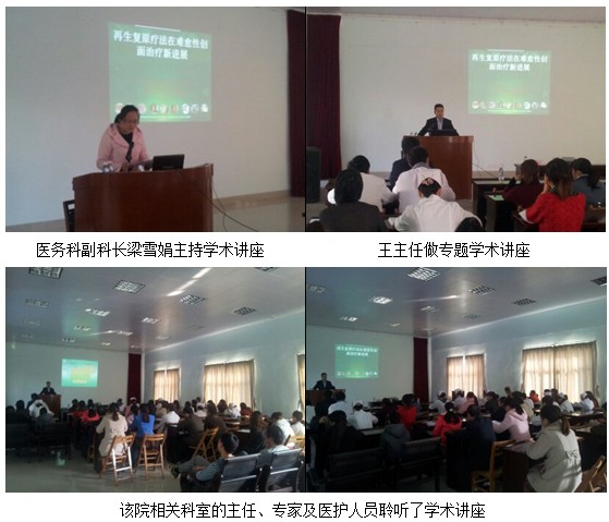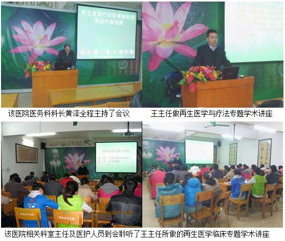 2012年12月6日,王主任应邀到广西水电医院进行 “再生疗法在烧伤、难愈性创疡创面治疗新进展”专题临床学术讲座。该医院原称广西水电工程局职工医院,是隶属于广西水电工程局的一所企业办综合医院,创建于1958年的春天(广西横县西津电站)。四十多年来,它随着广西水电的建设发展,辗转奔波于广西各个水电施工工地上。1975年建设大化电站时,定址大化至今。医院占地面积25亩 ,建筑面积 11351平方米 。床位定编145张。有职工155人,卫技人员118人,其中副高级职称8人,中级职称56人。