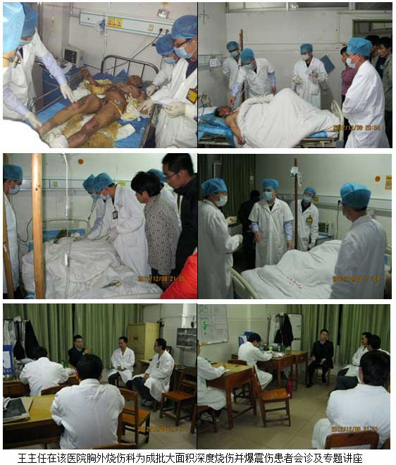 2012年12月8日早上,广西贵港市平南县人民医院急诊收治一批因大型气罐爆炸致大面积深度烧冲复合伤(烧伤并爆震伤)患者,当日上午该医院主管副院长兼胸外烧伤科主任臧德源紧急邀请王主任到该医院为成批大面积深度烧伤合并爆震伤患者会诊。该医院创建于1935年,是一所集医疗、科研、教学、预防、保健、康复和社区卫生服务于一体的综合性县(市)级医院,是平南县医疗业务技术指导中心,担负着全县130多万人民的医疗保健任务。医院设床位390张,年门急诊量近36万人次,住院病人1.6万人次.现有职工624人,有硕士研究生4人,高级职称14人,中级职称221人。