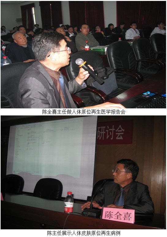 2011年9月26日下午2点整,讲座在该院外科学术厅举行,该医院外科主任,省中西医结合学会、烧伤专业委员会副主任委员王秉真、漯河市中心医院外科主任钱红军主持了学术讲座,在学术讲座中,陈主任首先向参会全体医护人员介绍了我国著名生命科学家徐荣祥教授。然后结合大量的临床病例图片,主要针对不同程度的烧伤后期创面及各类难愈性创伤、溃疡、压疮、疤痕等疾病的预防及治疗方法和注意事项。对创伤性骨病“慢性骨髓炎”的临床治疗也进行了认真细致地讲解,并解答了医师在处理骨髓炎中遇到的疑难问题;向学员们讲解微粒皮种植术在创伤、烧伤、溃疡创面与湿润烧伤膏联合治疗的病例,展示了种植皮浆的图像资料,认真解答了医护人员提出的问题。