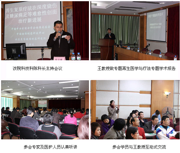 会议在下午两点半开始,在学术讲座中,王教授首先向与会医护人员介绍了我国著名生命科学家、医学家徐荣祥教授在人体再生复原科学领域取得的实验及临床研究最新进展,在2010年年底公布的“人体生命延续之谜(二)——线粒体主导日常生命”,破解了“精、气、神、力”旺盛与人体启动了再生生命程序有关,与细胞内各主要细胞器功能的发挥有关,并进一步证实了一个生命体可以同时具有“基本生命”和“再生生命”等,然后结合了大量的临床病例图片,主要针对不同深度的烧伤创面及各类难愈性创伤、溃疡创面的规范化处理方法与技巧、注意事项等进行了细致地讲解,并向学员展示了糖尿病足创面规范处理录像资料,再生医疗技术神奇的疗效博得了在场医务人员的热烈掌声。会议到五点半钟才结束,会后王主任还就学员们提出的问题一一做了详细地解答。会后各科领导表示将在临床全面地推广再生医疗技术,造福更多患者。