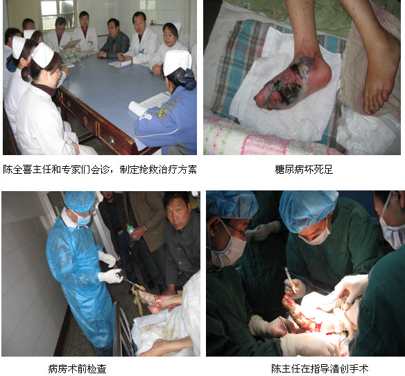 清明节前夕,中国中西医结合学会烧伤专业委员会专家陈全喜主任应邀到河南许昌市公疗医院创伤骨科会诊一位糖尿病坏死足诱发感染性休克病人。许昌市公疗医院前身是省级管辖医院原名为淮河二院,1970年更名为许昌市公疗医院。该院位于市中心紧靠市政府,总占地12760㎡,职工796人,病床510张,技术力量配备合理,设备先进,是许昌一家较有名声的医院。