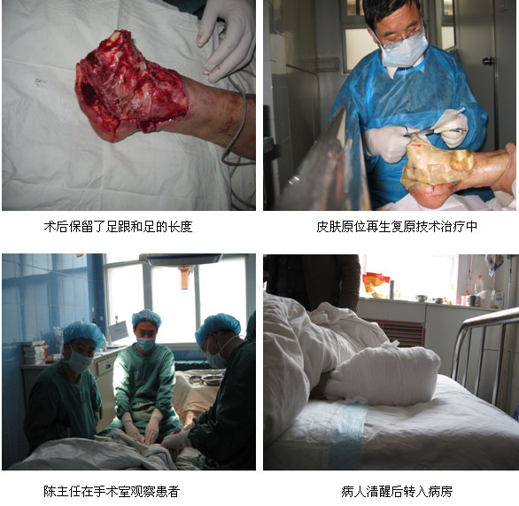 之后专家组与患者子女沟通,她们不同意截肢,要求用最好的技术、最小的损伤来治疗母亲疾病。根据家属的要求,医院决定应用皮肤原位再生复原技术千方百计保住患者肢体,治疗结果达到家属满意。在陈全喜主任的指导下,经过二天的抢救,坏死组织被清除,病人苏醒了。病人家属握住陈主任的手说:是你们的技术救了我母亲的命,保住了母亲的一条腿呀。