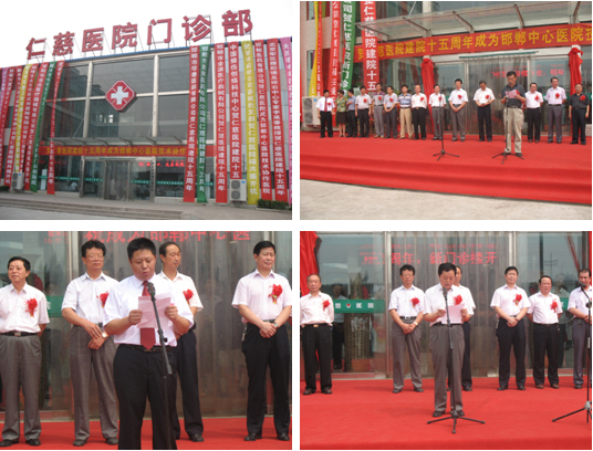 2010年8月8日,中国烧伤创疡科技中心武安分中心、河北武安仁慈医院举行建院十五周年暨门诊大楼落成、邯郸市中心医院技术协作医院成立庆祝活动。三喜临门,武安市仁慈医院张灯结彩,从医院领导到全体员工精神焕发、喜气洋洋,武安市领导和人大、政协以及卫生界各级领导出席盛会,武安市各级医院代表到会祝贺。