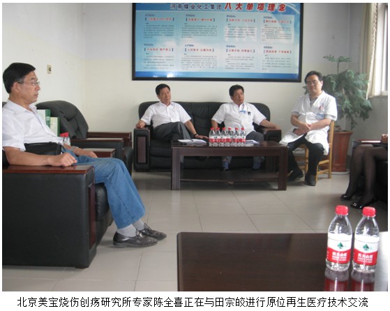2012年10月,河南皮肤再生技术推广基地与开封美宝烧伤创疡空分医院联合,联手开发永煤集团总医院,并在永煤集团总医院建立“皮肤原位再生基地”。此次培训进修医生由医院承担,技术培训由北京美宝烧伤创疡研究所临床部陈全喜教授负责。河南技术推广人赵俊国与贺杰锋、技术负责人陈全喜教授,与开封美宝烧伤创疡空分医院院长王文芳、医院工会主席张铭怜、宣教科科长杨斌等组成的开发皮肤再生基地团驱车赶到了永城永煤总医院。