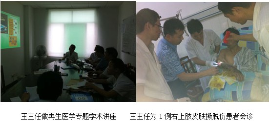 2012年9月26日下午三点,应该院外科文振伟主任的邀请,中国中西医结合学会烧伤专业委员会常委兼秘书、《中国烧伤创疡杂志》副总编辑、北京美宝烧伤创疡研究所副所长、第二临床研究部主任王洪生研究员来到该院到该科作学术和技术上的交流和指导,参会人员为该科室全体医护人员共10余人。会议在该院外科室举行, 王主任通过大量典型的临床病例图片及录像资料详细的介绍了再生医疗技术对深度烧伤及难愈性创面作用机理、再生复原疗法对各种不同深度烧伤及各种难愈性创面治疗方法和规范操作时的注意事项等,在授课过程之中大家认真听讲,并在授课后大家对王主任讲课内容进行了深入的探讨,王主任根据大家提出的问题有针对性的进行了讲解,会后王主任对该科一例右上肢撕脱伤病人进行会诊,王主任还亲自为病人换药,进行了现场的生动有效的临床指导示范。