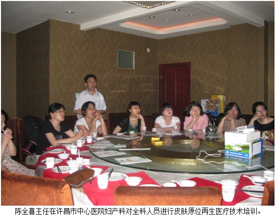 2012年5月17日,中国中西医结合学会烧伤专业委员会委员,北京美宝烧伤创疡研究所临床技术推广部主任陈全喜和河南办事处总裁赵俊国、区域经理葛艳妍应邀,来到了许昌市中心医院妇产科,受到妇产科主任龚军、陈书霞的热情接待。陈全喜主任再次来到该院进行更深入的皮肤原位再生医疗技术及其在临床应用培训。