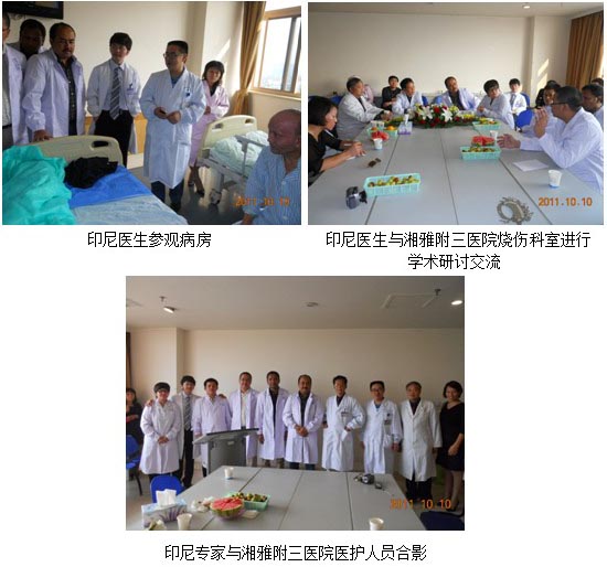 2011年10月8日,国庆长假后的第一周,湖南省三家基地医院迎来了由四名整形烧伤科医生组成的印尼再生医学团队,此次赴华参观学习的印尼团队由美宝印尼Dr. Doni Azmar 医生带队,印尼棉兰市亚当马利克医院整形外科主治医师Dr. Utama Abdi Tarigan,印尼爪哇岛西部城市万隆市阿桑萨迪金医院的整形外科主治医师Dr. Ali Sundoro,印度尼西亚苏拉威西岛西南部港市孟加锡市的斯特拉马瑞斯医院的整形外科主治医师Dr. Leonardo Rieuwpassa。印尼自2006年来与国际部配合及国内支持下多次组织国内外学习烧伤再生医学疗法,自2006年至今一直致力于再生医学在印尼的推广和继续教育项目,曾在去年、今年7月份分别赴四川、广州等多家基地医院学习了再生医疗技术,此次是第三次正式来华学习,几名医生也都有较为丰富的再生医学临床应用经验,并成功救治了多例烧伤患者。此行的主要目的在于对再生医学临床应用规范以及效果进行一次更为深入广泛的学习以及参观。