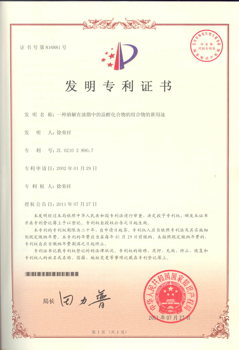 | ZL02102890.7 | 一种溶解在油脂中的甾醇化合物的组合物的新用途 | 查看 |
