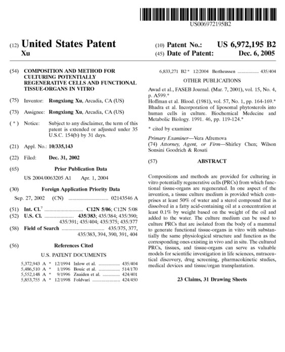 | 6972195 B2 | 在体外培养潜能再生细胞和有功能的组织器官的成分和方法 | 查看 |